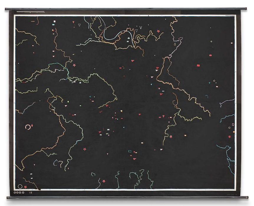 “For about 20 years Nanne Meyer has been working with maps, atlas pages and city plans. In their function, meaning, and aesthetics, they form the foundation for the question of one’s own orientation in the world … The artist frees cartography, consisting of surfaces, lines, colors, signatures, and symbols, from its interpretation of content … Depending on the state of science and on political as well as social interests, maps of the country and the world have always been an attempt to grasp, explain, and divide the world order.” (Barbara Nierhoff-Wielk, in: Meyers Handatlas. Nanne Meyer in the Liebermann Studio, Walther König, Cologne 2018, unpag.)