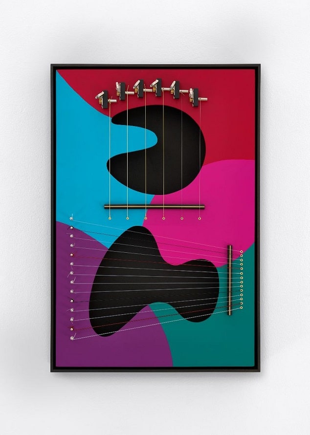Image caption: Nevin Aladağ, Vibrating Images, guitar – harp moondance, 2024, Wood, acrylic paint, guitar and harp mechanism, strings, 62 x 42 x 14 cm