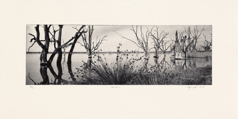 Calling In, a series of works on pape r by Nici Cumpston, capture the haunting beauty of the Murray-Darling Basin in New South Wales, Australia. These works are not only a poetic examination of the ecological crisis that grips this region, but they also tap into the specific Indigenous history of this landscape. Cumpston who has connections to the Riverland through her Barkindji heritage, describes ‘Calling in’ as: “what I literally do when I’m visiting specific sites but it’s also what I do subconsciously when I look for evidence of ancestral occupation of land.”(1)