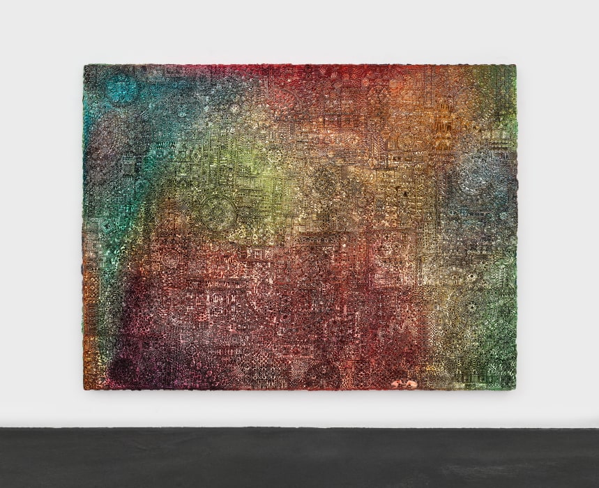 Pae White, Chimera, 2021, Car enamel and paper clay on wood panel, 184 x 245 x 11 cm