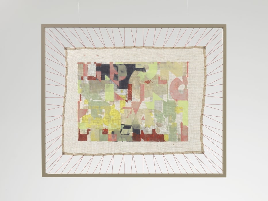 Pae White, Fussbudget, 2021, Linen, spackle, Dr. Martin dye, thread, wood, 62.2 x 75 x 4 cm