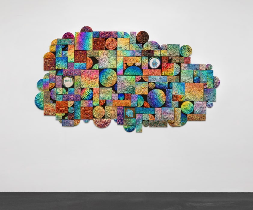 Pae White, Middlefauna, 2021, PVD coated ceramic tiles, sinamay, spackle, Dr. Martin dye, crabs, 125.7 x 228.6 cm