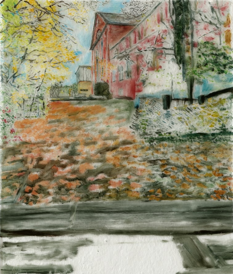 Paula Carralero is looking for the connection to original nature, thus a wider perception of our existence. Like an actual revelation, she receives the knowledge of nature, enraptured and yet true. She conveys this by using an optical trick: painting on a transparent ground, known as reverse glass painting in sacred spaces.