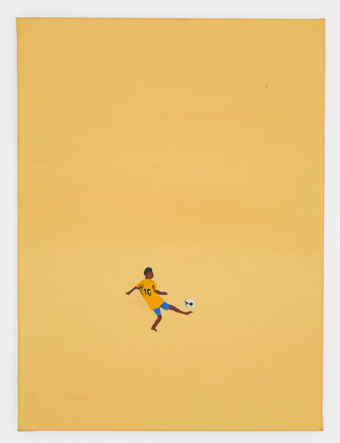 Caption image title: Paulo Nazareth, Sem título [Camisa 10], AlemaN’o / Série Amarelo-Laranja, 2025, Acryl auf Leinwand, 40 × 30 cm.