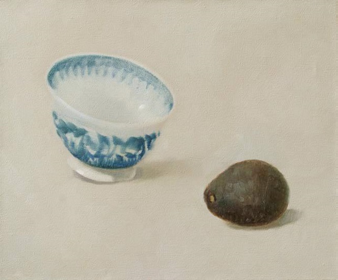 For unfathomable reasons, the rice bowl bows towards a rather unimpressive avocado. The consummately refined art object and the leathery, waxy, piece of shimmering fruit seem to be engaged in a rapt dialogue. The contrast between the two could hardly be more striking. The precious porcelain object, decorated in the blue-and-white style, summons a host of associations with East Asian and European art history. The bowl’s décor can only be guessed at: on the outside, a group of houses set among trees; on the inner edge, an ornamental frieze. Two pure white highlights may indicate a colorless glaze. In his reduced still life,