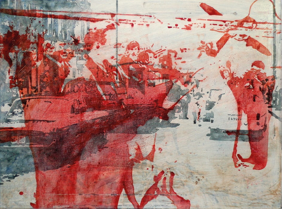 The horizontal format Tug of War, which also concentrates on the colours blue and red, is underpinned in blue by Pariser Platz with the suggested Brandenburg Gate; superimposed in red are the outlines of playing children competing in a tug of war. The title can also refer to the decades-long trial of strength between the Eastern Bloc and the West.