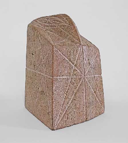 “Kriester’s work on mighty limestone blocks produced a new, strictly closed basic form in which notches are punched into a geometric pattern. These notched lines lay a structure over the heads, which they emphatically objectify, as if they belonged in a much wider context. The score lines refer to a higher order, a pattern of foreign reason that frees the heads from their daily suffering and life constraints. What Kriester’s sculpture always impressed, namely the plastic structure gained from the form, now clearly emerges from itself.” (Jens Christian Jensen)