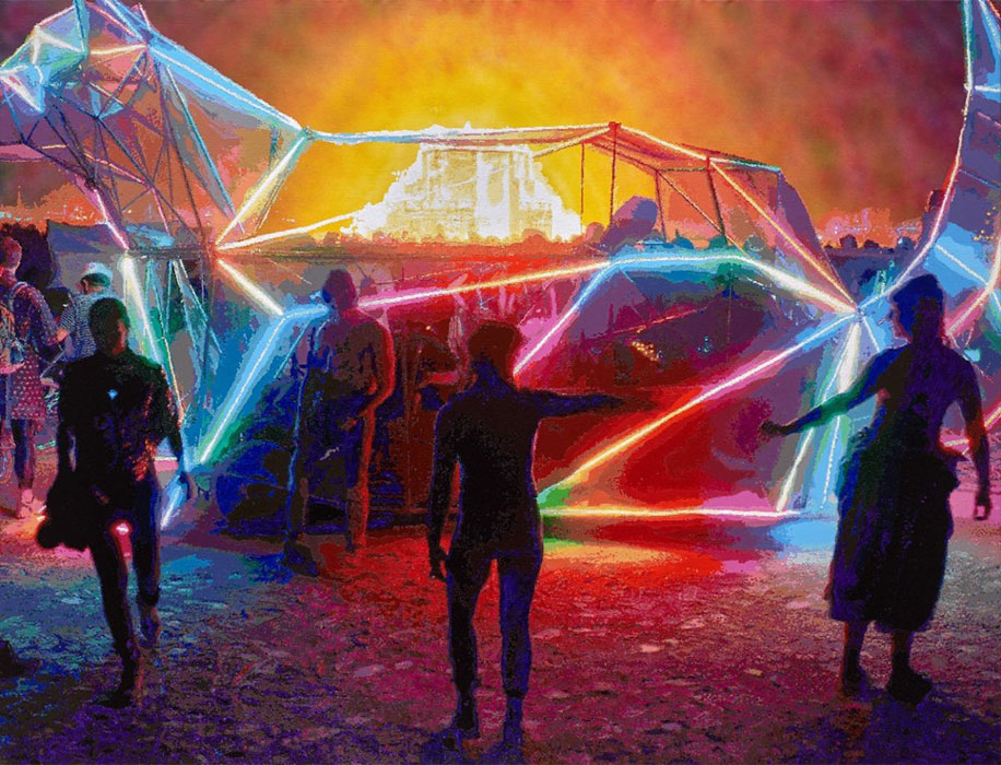 Living and working together since 1998, the artists Nina and Torsten Römer (*1978 in Moscow and *1968 in Aachen) met at the Kunstakademie Düsseldorf where they became master students of A.R. Penck. Their artistic work is based on the transmission of their photographs to large-format panels, offering viewers a juxtaposition that is both essentially sensual and media-reflexive. In the works by Römer + Römer, the indexical principle of photography – the testimony of a past event inscribed in the photographic act – is entangled with the artistic aura of painterly origination. In the highly complex multistep process of image production, Römer + Römer relentlessly examine moments of our present that concern ecstasy and the dissolution of boundaries. Creating, for example, major work cycles about the Carnival in Rio de Janeiro and about the Fusion Festival in Mecklenburg-Vorpommern. This is the point of vantage for the current series focused on Burning Man, which has evolved into a cultural phenomenon since its inception in 1986, with up to 70,000 people traveling to a place where they become actors of a creative community aimed at immersion.