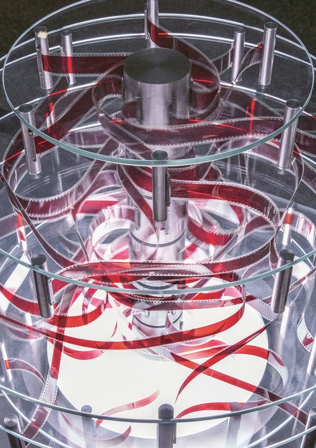 Caption title: Rosa Barba,Off Splintered Time, 2021 (detail), glass, motors, 35mm film, LED light, 70 x 80 x 80 cm (sculpture). Courtesy of Rosa Barba and Esther Schipper, Berlin. Photo © Andrea Rossetti
