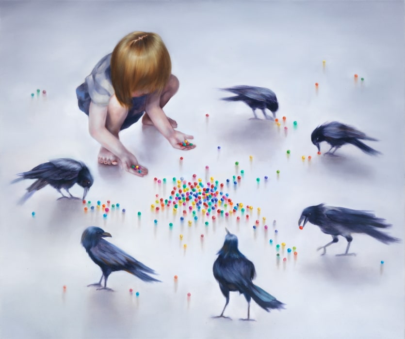 In many of the artist’s paintings, the characters – mostly children and young women in often domestic surroundings – are lit up as if by a flashlight. Something has happened or seems imminent. Unmistakably, looks and gestures convey the reliving of upsetting experiences.