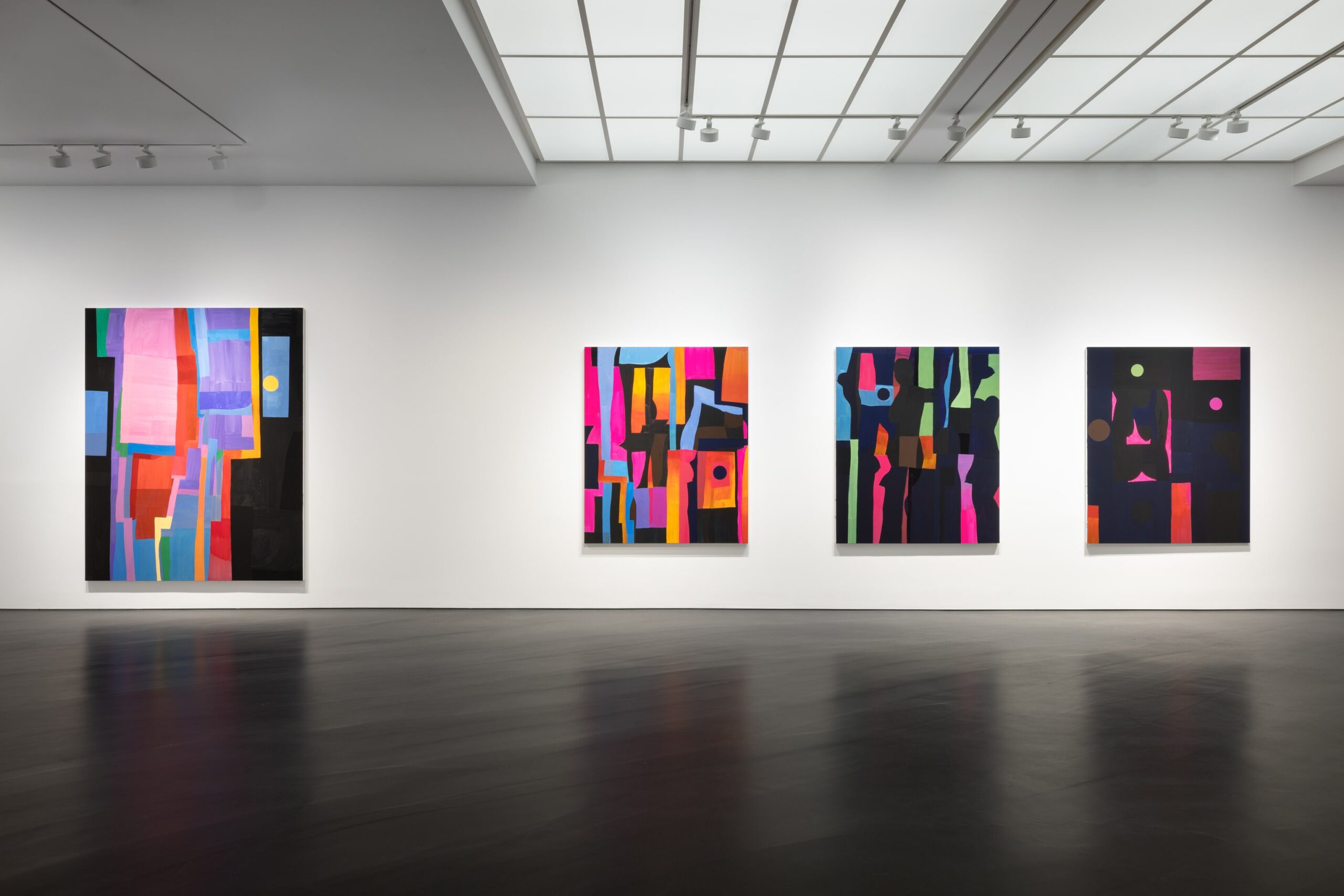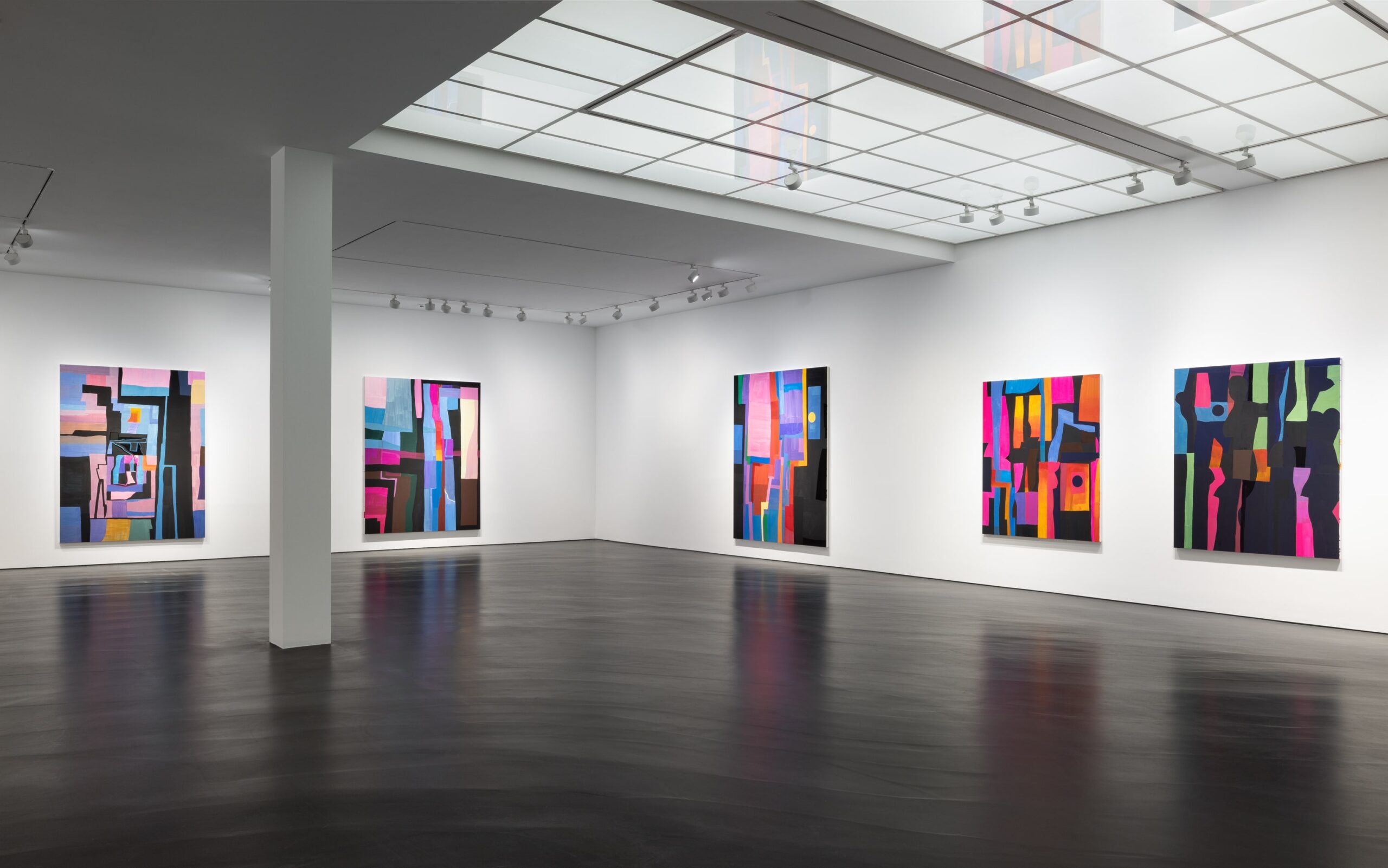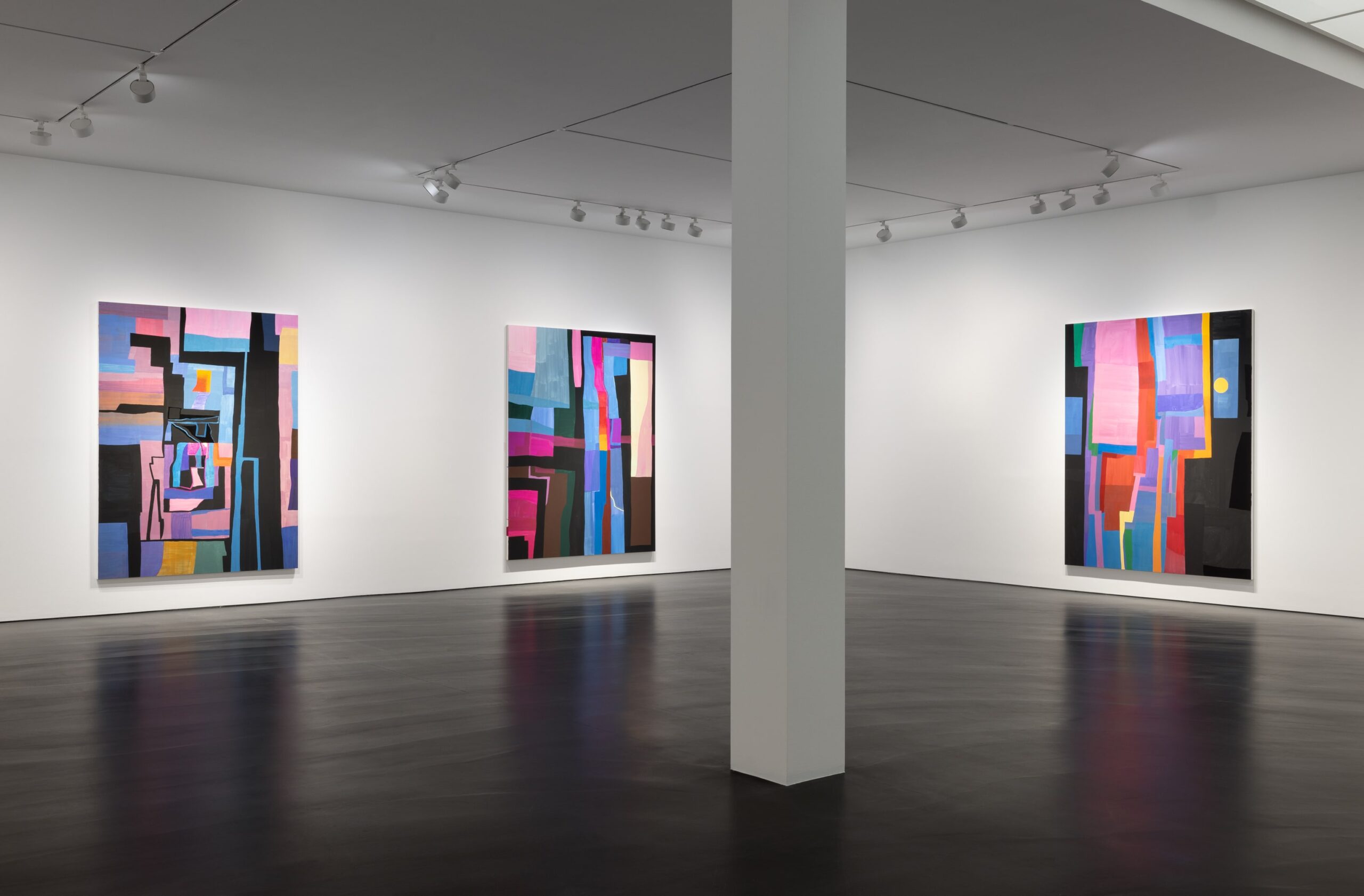 The colours in Parsons’ paintings are linked to formal and emotional associations: Bright colours like pink and bright reds allude to the unreality of artificial lights in an urban setting, a sunset framed by the Manhattan skyline, or a bright summer day. And while the browns in some of the new paintings are reminiscent of forests, the light greens bring spring into a wintry landscape. A series of 15 small-format paintings takes up an almost monochrome colour palette and uses different shades of black, created by changes in viscosity and gloss, reminiscent of the black-on-black paintings of Ad Reinhardt.