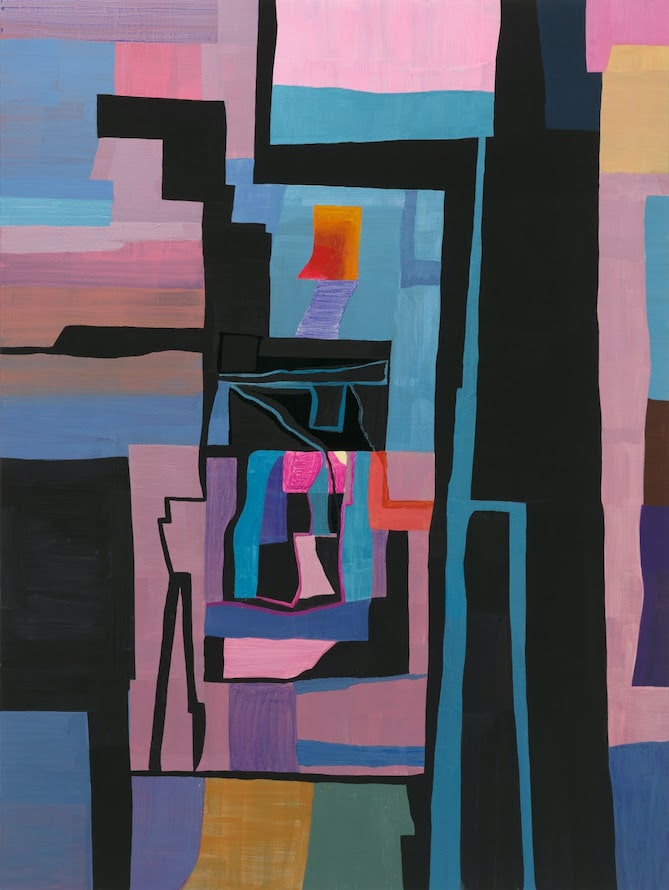 The vividness of everyday experiences, but also the strangeness of existence, form the basis of Sojourner Truth Parsons’ work. Her paintings have an astonishing atmospheric intensity. They combine bright colours, silhouettes of bodies and black surfaces that simultaneously function as architectural elements and framing. The compositions move on the threshold between abstraction and representation, oscillating back and forth, whereby recognisable forms such as bodies, but also flowers, streetscapes or landscapes can never be definitively fixed in one register or the other. The iconography composed of overlapping elements – layers of colour alternating with thin washes, matt surfaces with slightly shiny and iridescent passages – constructs an inner world that is more psychic landscape than forest or city block, embodying an emotional truth.