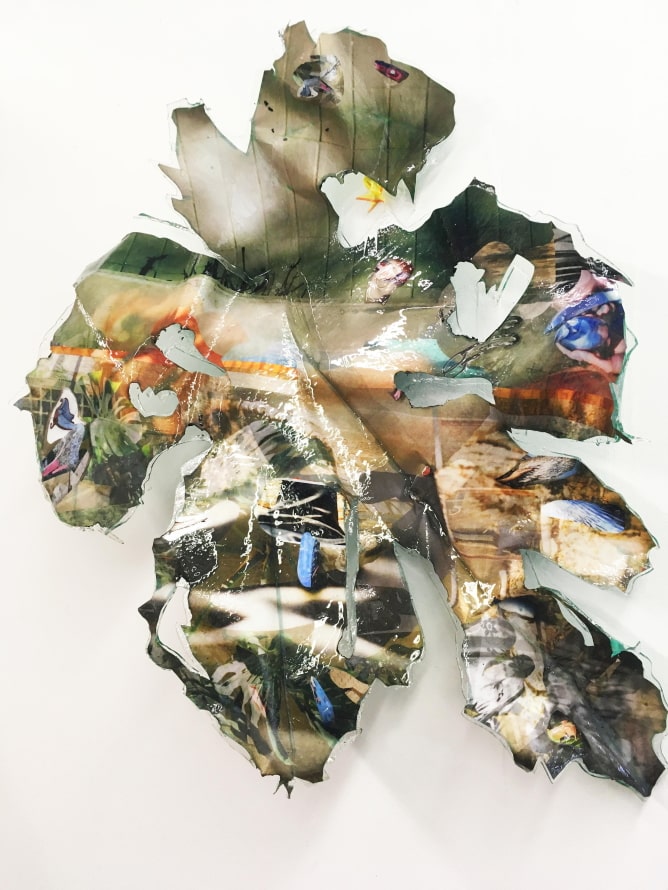 They are positioned on custom-made elaborate see-through stands, which perch the objects above the ground, almost floating. E.X.P.O (sub sole) plays with the concepts of inside vs. outside and blurs the lines between these two normally separated spheres. In front of the wallpaper, a traditionally ‘inside’ feature, a park bench is positioned surrounded by leaf objects. The bench is reduced to its silhouettes and digitally transformed into an object that floats between functional and untouchable. This interplay between nature and the human presence or consciousness and the dream world allows Dunkelberg to examine ideas on creation, reality, and morality.
