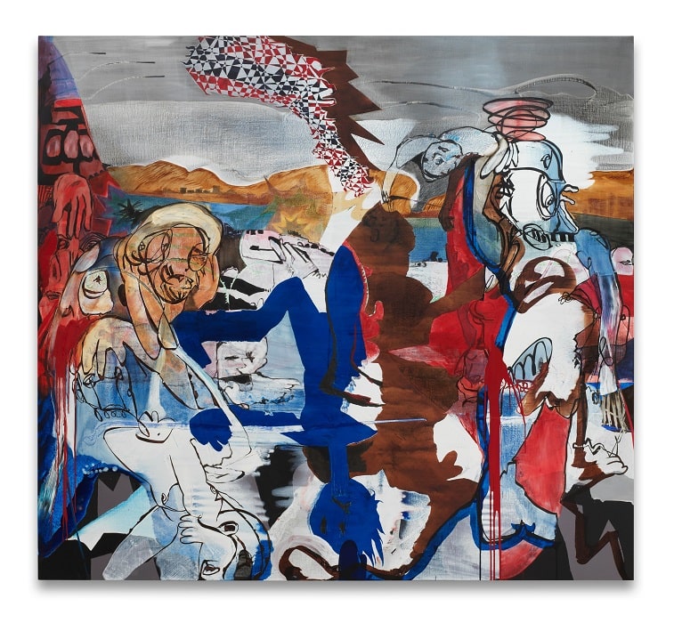 In juxtaposition to this work, Hirsig presents a series of paintings with a considerably calmer, more grounded tone. Depicting abstracted female figures, these works represent Hirsig’s answer to the question of how the world can be liberated and healed from its cycle of upheavals, displacement and violence by nurturing a more feminine view of the world: choosing the creative rather than the destructive as the guiding principle of conflict resolution and replacing blind hatred with compassion. In this way, Neue Welt expresses Hirsig’s ongoing commitment to the diversity and ambivalence of human nature, in which the vibrant plurality of his compositions comes to represent a radical gesture of tolerance.