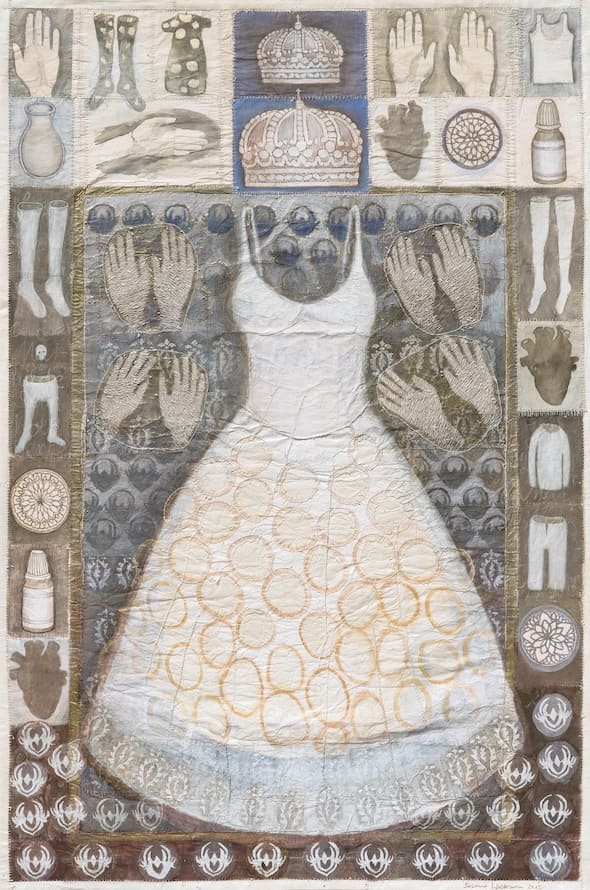 Stitch by stitch, Susanne Waltermann creates iconographically idiosyncratic works that are as complex as the list of materials used and permeated by a wide variety of thread types. Her own body and its perception play an important role in her artistic practice: ‘I lay the paper on the floor, then lie down on it myself and paint the outline around me.’ In a lengthy, intuitive process, she creates works that are sewn in several layers onto Japanese paper and silk paper. In art history, sewing represents a deeply personal activity; cutting, tearing, sewing and joining are associated with ideas of atonement and the expression of emotional tensions.