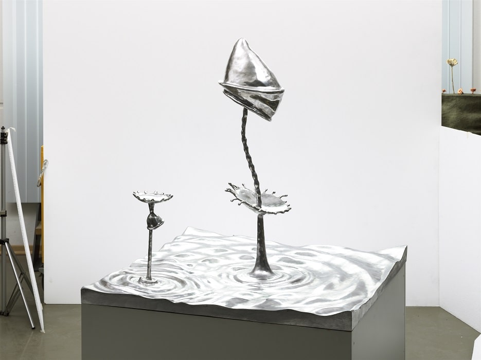 The images of this film were the first impulse for Anna Bogouchevskaia to deal with the microcosm of the “drops” and to make it her own through sculpture. She wanted to give form to what “only exists for a second, a third of a second”. Her new, high-relief sculptures take the viewer into the strange, microscopically enlarged world of forms of water surfaces. Out of this uniformly structured surface rise manifold figures, each framed by concentric wave patterns that capture different stages of that sequence of movements that begins when a drop hits the surface of the water: from a wreath-like blossom with a softly serrated edge to small and larger cones to towering columns with spherical drops as heads.