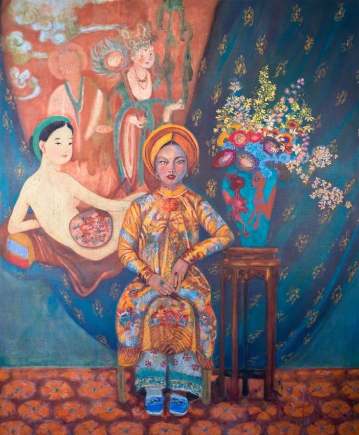 Two women sit on the edge of a pond dotted with lily pads, playing the sitar. Behind them floats an ethereal figure, bathed in golden light – perhaps the guardian of the garden in which they sit, or a manifestation of the music itself? Annam, a solo exhibition by the Vietnamese artist Tuan Vu, casts us into ornate scenes, lush with colour, plant life and rich fabrics. They are part paradisal visions, part homage to the culture that the artist left behind when he immigrated to Quebec.