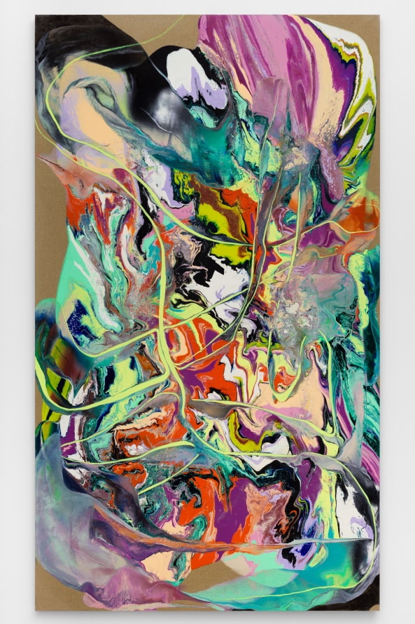 Typically kept to a portrait format, Tyra Tingleff ’s expansive visual world is fluid, limitless, punk, unrestrained. Combining a manifold of techniques in her oil paintings on raw canvas, Tingleff balances vibrant shades and hues that refract like sedimentary layers. With an infinity of decisions coursing beneath each trace the paint leaves behind, Tingleff ’s work operates at the spillage of foreground and background. Gathering various layers of pigment, Tingleff creates immense fields of color that twist and marble as they pool and sink together on the untreated fabric. Dripping and staining the linen, her smooth layers of paint appear molten, obscuring any points of reference the eye searches for. This manipulation of depth and her distinctive style allows Tingleff to stand out amongst the long lineage of abstract painters who came before her. By appealing directly to the viewer, the paintings invite one into an endless loop of deciphering, composing a febrile universe punctuated by the chance possibilities that went into each piece.