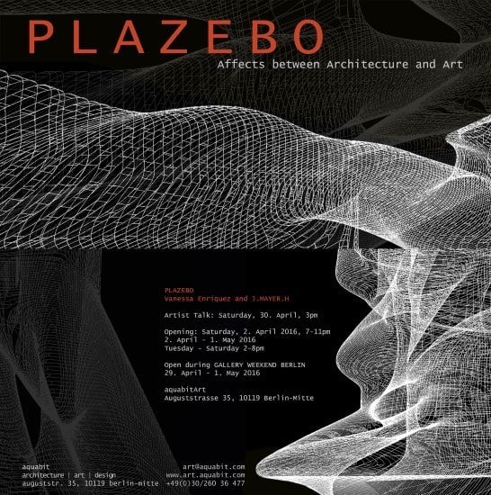 The artists Vanessa Enriguez and J.MAYER.H (MEX-D) are showing artworks concerning the topic “Architecture + Art”. The exhibition is entitled “PLAZEBO – Affects between Architecture and Art”.
