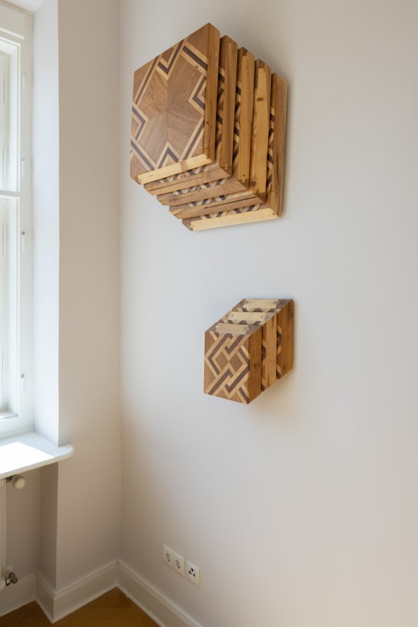 A counterpart to the wall unit as a life archive is found on the wall opposite in the form of pieces of parquet flooring from a Hamburg Wilhelminian villa, cut out and stacked in perspective. “Kniende Madonna mit Kind” (Madonna Kneeling with Child) from 2019 is a typical example of the deliberately confusing strands of interpretation in Via Lewandowsky’s works. Kneeling on a parquet floor, stacked into figures, Madonna and Child as a distorted perspective?