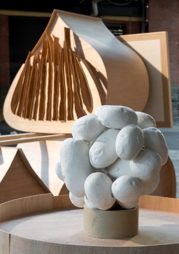 Image caption: Carriage / 2016 / Plywood, framed drawing, plaster