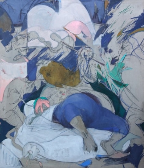 Image caption: Tina Schwarz, Das Blaue, 2017, Pastell, Öl und Acryl auf Leinen, pastel, Oil and Acrylic on linen, 180 x 148 cm | 70 3/4 x 58 1/4 in