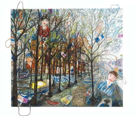 The artist, born in 1962, became known for his bag projects. He travels to metropolises around the world. The impressions that the big cities leave behind are reflected in his large-format pictures, which are painted partly on shopping bags. THITZ paints with acrylic paints. His style is realistic, cheerful, playful and ironic, not abstract. Numerous small episodes line up and produce pictures on which the eye can wander for a long time. He uses the writing as a quasi-audiovisual tool. Noises, dialogues, advertisements and moods of a never-resting metropolis are thus brought to the attention of the viewer.