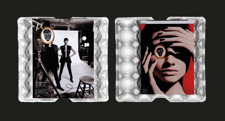 The starting point for “Mode – fication”, a play on words from his playing and experimental style, are fashion posters that seem devious to the artists living in the south of France in their expression, in their “Mise en scène”. So he puts in the line of sight of the models skulls, which are painted on real eggs; He is then to give meaning to the expression of the models, which is empty of his feelings.