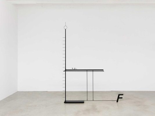 f=different 3/1/1 (2016), Marlena Kudlicka’s sculpture for 3/1/1, stems from the image of an industrial paper cutter. Skeletal, linear, and to some extent graphic, the function-like, geometric sculpture, made of powder coated steel and glass, spatially outlines a height-width ratio that thematizes the notion of paper in terms of typology of formats. f=different 3/1/1 is a sculptural, self-referential drawing in space dealing with the preconditions of drawing as such.