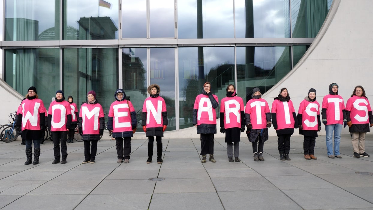 Image above: fair share for women artists, Aktion am 08.03.2023 um 12 Uhr am Marie-Elisabeth-Lüders-Haus, Photo: Petra Weller.