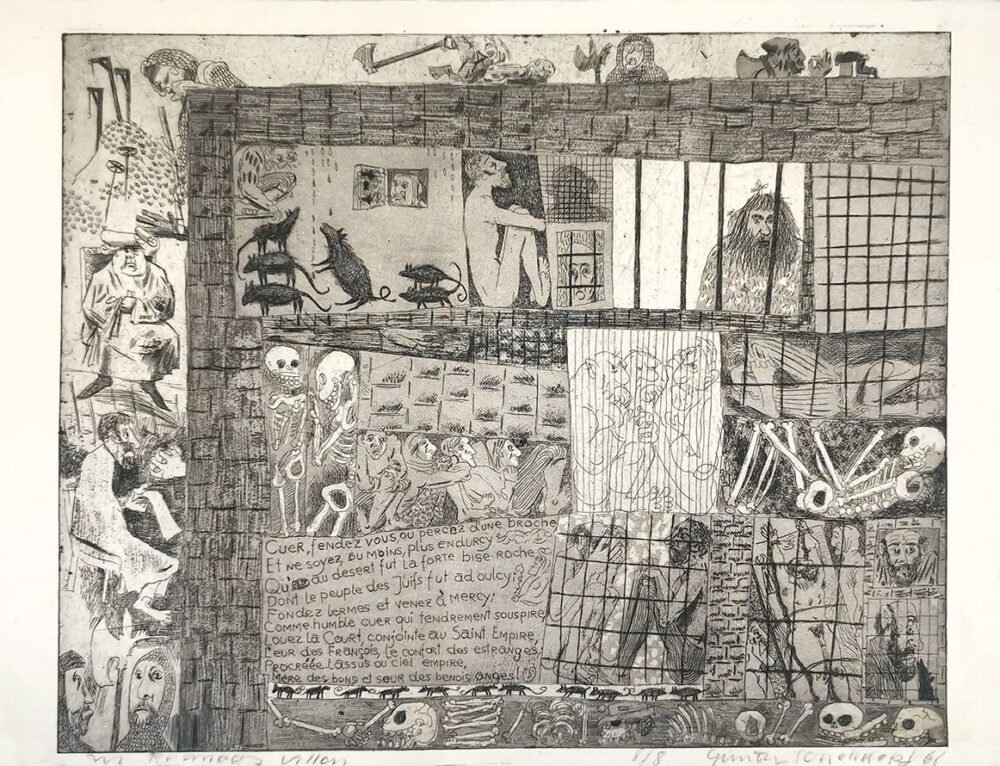 Günter Schöllkopf — Louenge à la cour (Zu François Villon), Radierung, Druckplatte 24,8 x 29,6cm, 1958, 8/8 ©feinartberlin