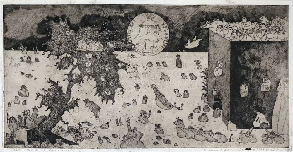 Schöllkopf produced the early cycles such as Zu Balzac and Ost-West at the age of 17, a young man full of drive, a challenging spirit, rebelling against traditional structures and struggling with inner contradictions. He found his language in printmaking and drawing, creating a cosmos of images for his knowledge and thinking – especially in etching: “I am a man of metal”, he wrote in his diaries (German Literature Archive Marbach Collection).