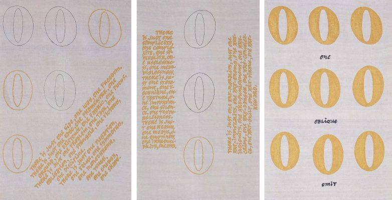 This show follows as a continuation of their ongoing interest in how modernity shapes our cultural and political reading of the present. The exhibition features a series of new collaborative and individual works by the artists, including their most recent series Oneness (2015) made on hand-woven linen fabric featuring text and symbols inspired by a conceptual text by Ad Reinhard and a graphic design by Bridget Riley first published in a small-edition publication on concrete poetry from the late 1950s.