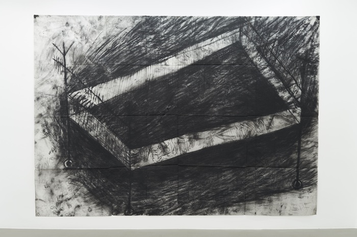 Meng Zhang At Nowhere No.1 (Nirgendwo) 2020, charcoal, wax on transparent paper 120 x 180 cm. Installation view