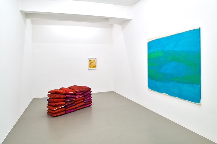 Tamina Amadyar buji 2024, pigments and glutin on canvas, filled with polyester cotton 28 parts, 40 x 50 x 12 cm each; overall 72 x 130 x 50 cm