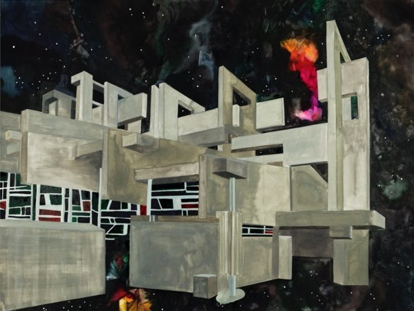 In her gouaches of architectural sites, Isa Melsheimer constructs small autonomous worlds, seemingly detached from their real-world settings. The artist often chooses black and white source material showing the buildings in their original condition, that is, without signs of subsequent decay or dilapidation and without later architectural or landscaping additions. The impression of these structures existing in a self-contained, timeless space is further emphasized by the fantastic elements that appear in these environments: wild animals like foxes or porcupines, clusters of brilliantly colored crystalline formations or extravagantly dark starry night skies.