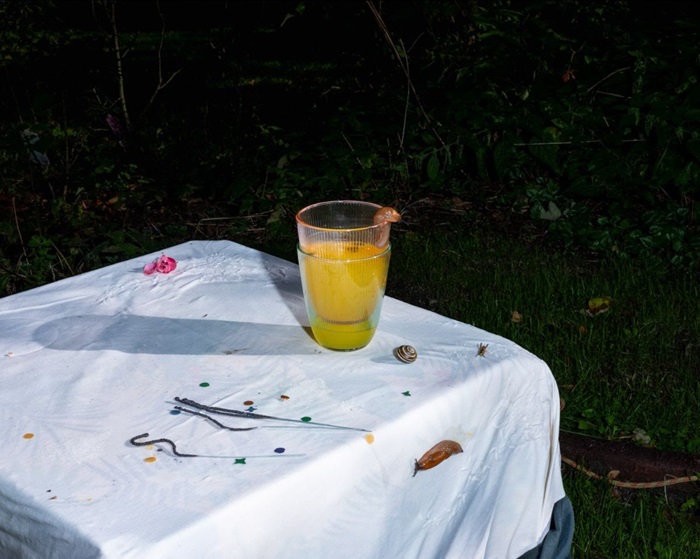 ‘For my new work, I invite myself to eat and drink in the gardens and on the terraces of my friends. The place settings on the garden table become the basis of a still life through my intervention. After I leave, a camera remains behind as a passive observer for a few hours or whole days. It is triggered by movement when birds or wild animals visit the table. In this way, images are created where it is not clear whether it is a documented scene or an arranged still life. I find it fascinating to combine the staged and the accidental in one picture. Plates is a semi-documentary still life study dedicated to the grey area between the habitats of humans and wild animals,’ explains the artist.