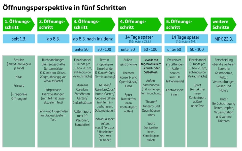 A so-called emergency brake is provided for: If the 7-day incidence per 100,000 inhabitants rises above 100 for three consecutive days in the country or region, the rules that applied until 7 March will come into force again as of the second following working day.