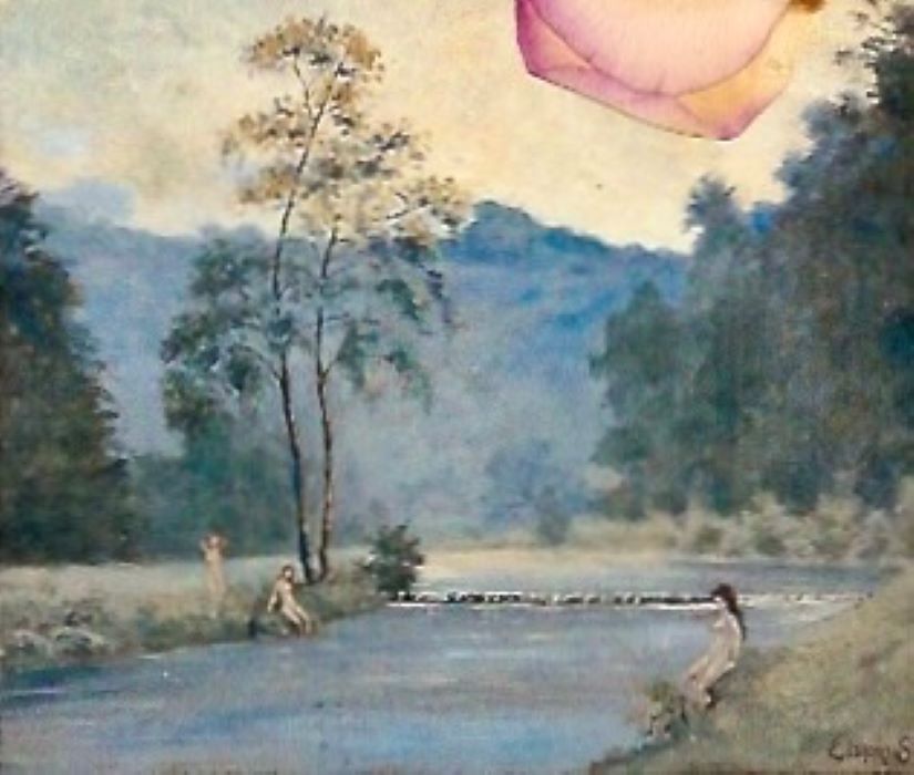 Caption title: L. M. Eilshemius, Three Girls and River, 1907, Collage with petal on photo paper, 11,7 x 14 cm, 2022, Courtesy Galerie Stella A.