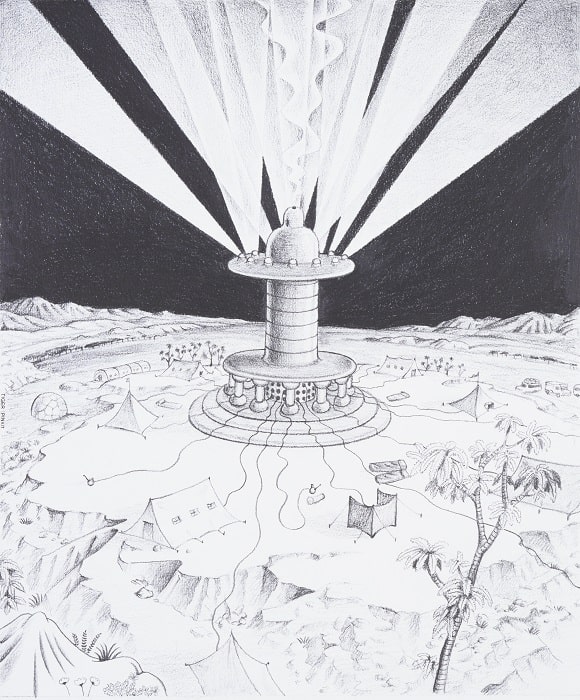 Fig. above: postmoderne-0019 Ettore Sottsass, Der Planet als Fest: Studie für einen Spender von Weihrauch, LSD, Marihuana, Opium, Lachgas, Projekt (Perspektive), 1972–1973, © VG Bild-Kunst, Bonn 2023, Museum für Moderne Kunst / Scala, Florenz