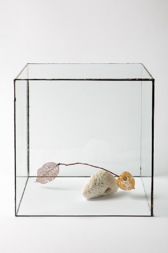 Abb. oben: Elisabetta Di Maggio, Vuoti d’Aria #01 [Luftleer #01], 2021, Bleiglas, Zweig, Blatt einer Shallon-Scheinbeere, Kelch einer Physalis Akekengi Pflanze, stabilisiert und handgeschnitten mit einem Skalpell, weiße Koralle, 30 x 30 x 30 cm. Mit freundlicher Genehmigung der Künstlerin und der Galerie Christian Stein, Mailand