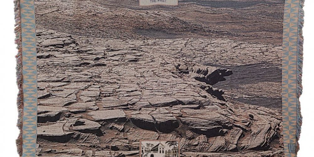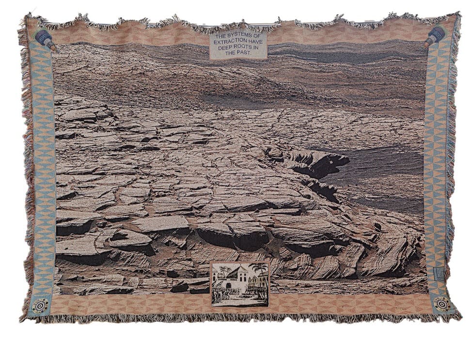 A series of machine-woven tapestries by Kyriaki Goni depicting landscapes of Mars examines the neo-colonial practice of space exploration and the exploitation of extraterrestrial environments. The soft feel of the tapestries has something provisional about it, conveying a gentler, feminist perspective—a perspective that raises the question of whether it is possible to approach new terrains with care and respect.