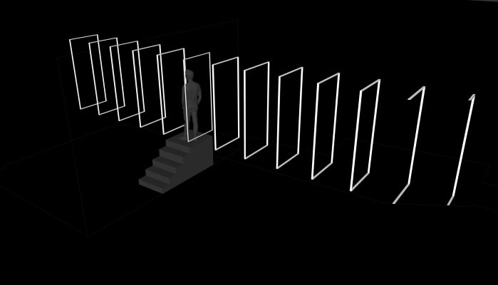 He uses multiple “frames of light” which dimensions correspond with the height and breadth of the entrance to the gallery backspace.