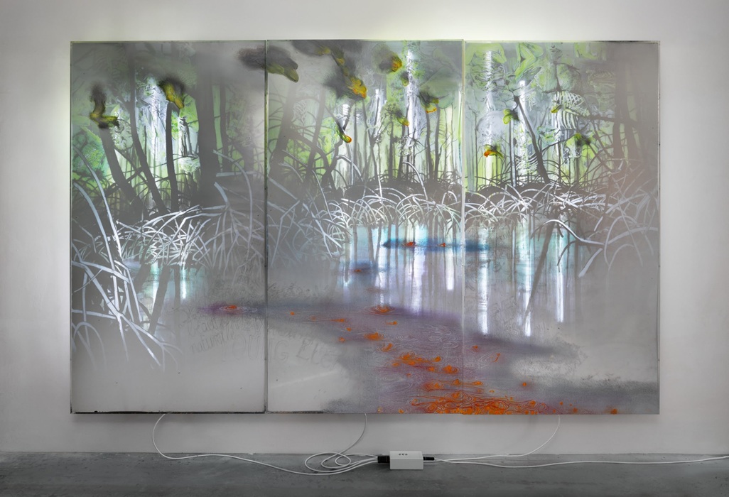 Title image caption: Philipp Fürhofer, Untitled, 2024, Oil on acrylic glass, spy mirror, LED-tubes, cable and controller box, 232 × 366 × 13 cm.