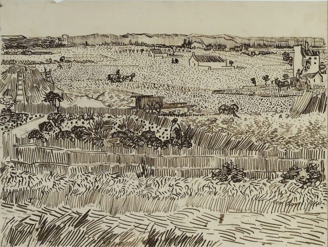 Vincent van Gogh managed to create a summerly landscape by using dots and lines. One has the feeling as if he’s working on his first draft, working on image composition. There are other variations of this drawing. The focal point and the pictured landscape stay the same, also the late summer harvest motif are reused. This drawing was purposefully drawn for Emile Bernard, who had written contact with van Gogh, Paul Gaugin und Paul Cezanne and as an artist himself, participated in the radical change of arts in the late 19. Century.
