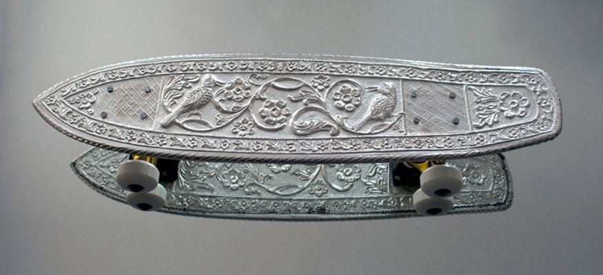 Image caption: Jeanno Gaussi / Dreams on Wheels_Delhi / 2015 / Skateboard, Eisen / 72 x 10 x 18 cm