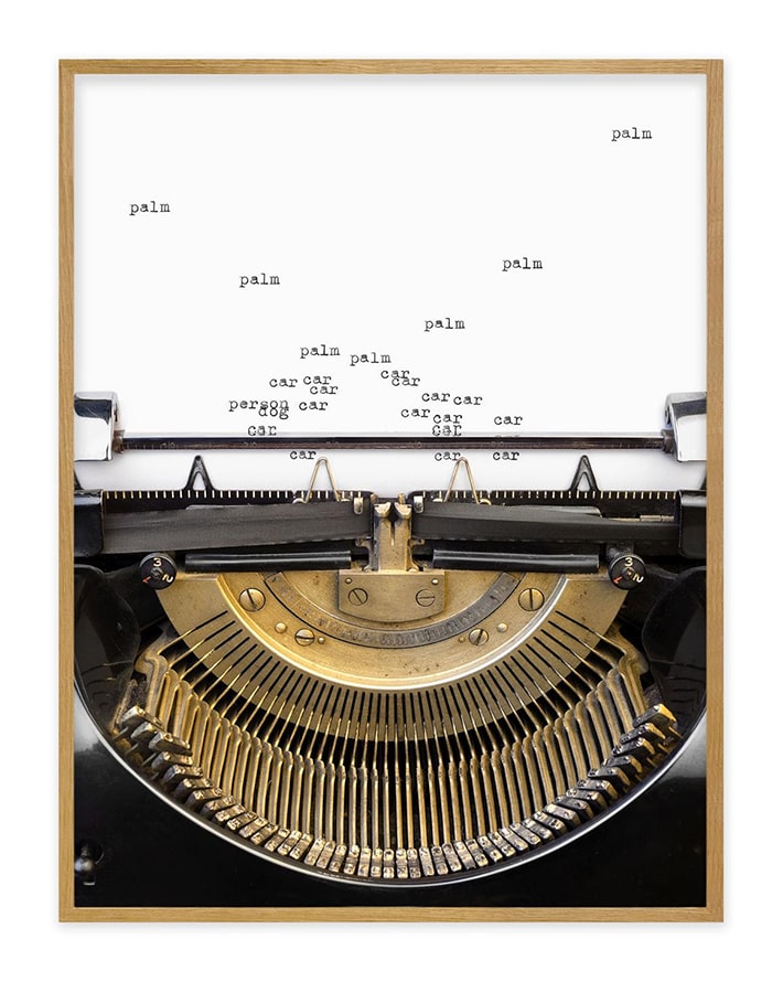 Not only that: Just as Binschtok combines analog and digital worlds, blending the 20th and 21st centuries in her series “Typewriter Photographs,” she also creates a new space that resists attempts to locate it within time. We feel removed from our own present moment, and when we ‘read’ the typed images of information captured by AI, it sets off a mental cinematography that leaves everything open. Reflecting on and analyzing media thus simultaneously becomes–first and foremost–poetry.