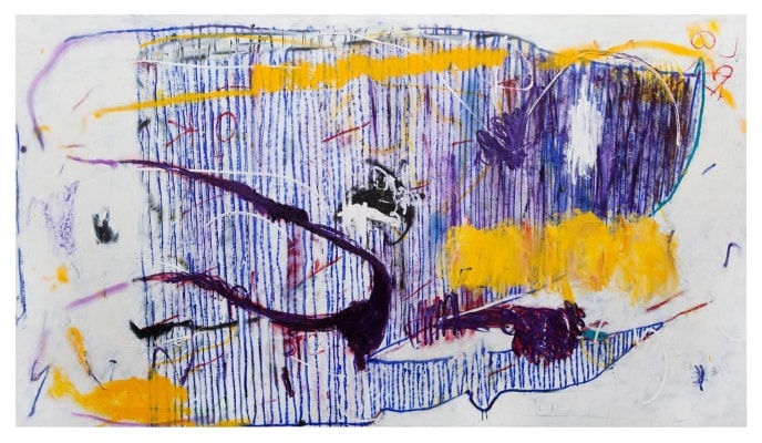Heavy contrasts are predominant in the works of “OK BOY”, the most recent body of work by Berlin-based artist XOOOOX. It is comprised of large black and white canvases whose monochromism is at times interrupted by mostly primary colors. Getting closer to the works, one quickly realizes that these contrasts are less subject to a fixed concept, but are developed in an intuitive process. Not only the chiaroscuro of the Black Paintings, but also the violet and yellow colors – characterized by Johannes Itten as a complementary contrast – arise after a long process of layering and overpainting. What all of the works have in common is the act of strongly kinetic painting, be it priming backgrounds, blackening surfaces or quick gestures with the spray can. The technique of this painter, who approaches the canvas without a paintbrush, intuitively spreads the color with his bare hands, is reminiscent of works of abstract expressionism, the likes of Robert Motherwell and Franz Kline who also based the effects of their work in a very strongly physically act of painting.