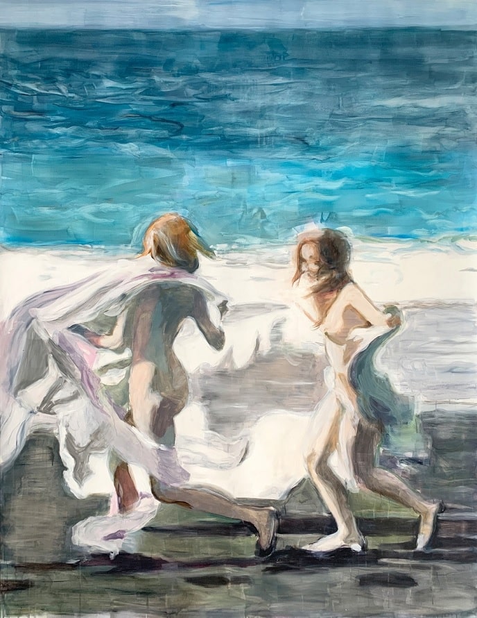 By superimposing images from mass media and film stills with her own feelings, she creates new images that express freedom, closeness to nature, eroticism and individuality, but also vulnerability. Real and fabulous creatures want to seduce the viewer to lead a free and self-determined life in a safe place. With effortless, fluid and lightly applied colours, the artist playfully underlines the seriousness of her works.