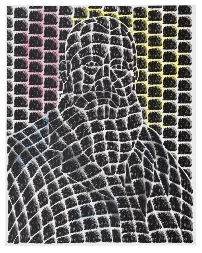 For Durchscheinen ist alles, Bayrle takes as a point of departure his return to painting, closely reflecting upon the innovative approaches of his artistic forbearers and colleagues. The presentation’s eight monumentally sized canvases begin as detailed, full-color hand-applied imagery in the manner of traditional paintings. These are in turn obscured, printed over with networks of scaled-down motifs showing the repeated detail of a textured brushstroke. The brushstroke is typically understood as an expression of an individual artistic mark, but here this isolated motif is multiplied to illustrate various different portraits. The reshaped contours of Bayrle’s silhouetted, jet-black brushstrokes adhere to the now-concealed underlying paintings as if they were intended as preliminary sketches. These portraits are accompanied by a number of works on paper that translate the canvas’ imagery. In contrast to the works on canvas, these unique compositions are overlaid with color as gestural applications of acrylic.